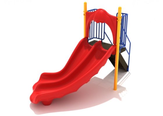 The 4 foot Double Right Turn Slide offers two slides on a single structure. Each of them turns at a different angle, with the inside turn being a little sharper and shorter. Its extra wide top deck platform allows two kids to line up at the start of the slide. The deck and stairs are both coated in a weatherproof PVC coating which provides traction to help eliminate the risk of accidents from slipping. For the same reason, all stairs and exposed edges have secure handrails alongside them.