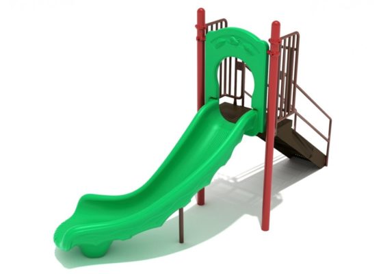 The 4 foot Single Right Turn Slide is yet another excellent model of freestanding slide, particularly if you do not have space for a larger structure in your playground. The curved shape of the slide reduces its overall footprint and use zone areas. Like our other available slides, the 4-foot Single Right Turn Slide uses PVC coated steel for its stairs and top deck, which makes for non-slip surfaces and sturdy construction designed to last. Its 3.5 inch posts provide plenty of support, and the decorative entrance to the slide will allow children to imagine they are entering another world. The entrance and slide are made from durable rotationally molded plastic with a smooth surface that reduces friction.