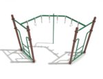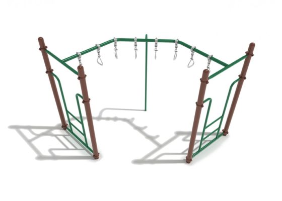 The 90 Degree Swinging Ring Ladder is an extended overhead climber with two 45-degree bends in its shape. It uses eight ring grips hanging from the overhead beam, which are designed to allow children to easily swing from one to the next. The swinging motion makes the activity much more and exciting by adding an entirely new element of challenge to the activity. Rather than simply challenging kids’ upper body strength, this activity tests their agility and coordination as well. This structure is somewhat difficult to master, but still encourages children to keep trying and having fun.