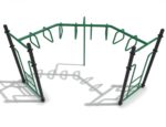 The 90-Degree Trapezoid Loop Ladder is an exciting and extensive overhead climber which uses interesting shapes. The rungs each have a trapezoid shape, which makes them lower and easier to reach, and also creates a wide bar for children to grab onto, since trapezoids are wider at their bases. The path of the climbing structure as a whole takes two gentle 45-degree turns, which allow a longer structure to fit in a shorter space. The turns also make the climbing experience more varied and different if children start from the other side. The structure has an additional vertical support post in the middle of its length to support the unconventional shape.