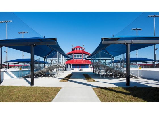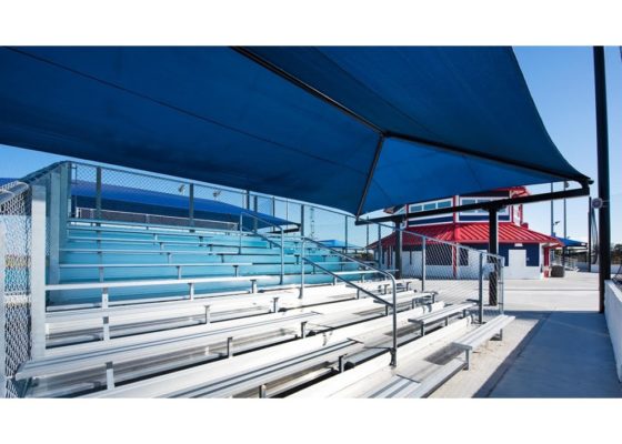 Finding shading options to fit large bleachers is no problem with the Bleacher Series Dual Column T Cantilever Fabric Shade. This fabric shade comes in many sizes which is to accommodate large seating sizes up to 10 rows in height. With this in mind it has a four-post positioning, two on each side of the shade, which allows for more room, more visibility and ease of access. For stadiums, parks or outside fields with large volumes of visitors this is a valuable piece to add to your seating.