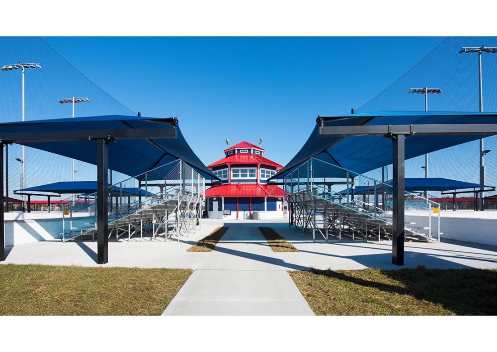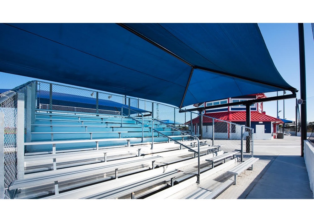 Finding shading options to fit large bleachers is no problem with the Bleacher Series Dual Column T Cantilever Fabric Shade. This fabric shade comes in many sizes which is to accommodate large seating sizes up to 10 rows in height. With this in mind it has a four-post positioning, two on each side of the shade, which allows for more room, more visibility and ease of access. For stadiums, parks or outside fields with large volumes of visitors this is a valuable piece to add to your seating.