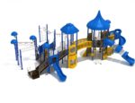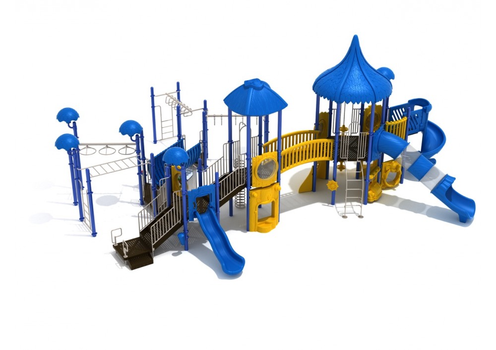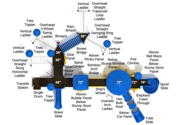 The Crazy Capuchin play structure is designed for children who are between the ages of 5 and 12 years old. The lower part of the structure has four different styles of overhead climbers. The classic Overhead Ladder and Rung Ladder have firm grips to hang from, while the 3-Wheel Overhead Spinners and Swinging Rung Ladder move freely for more difficulty and fun. After trying the overhead horizontal climbers, they can use the vertical Spiral Climber, Pod Climber, and Inverted Arch Climber to reach the upper levels of the structure. There, they have access to a Wave Slide, Tube Slide, and Spiral Slide, all of which are set at different heights to provide a large range of different experiences to enjoy. The Crazy Capuchin also has a collection of activity panels all over its structure, including a Gear Panel, Plinko Panel, Stump Store Panel, and Ball Maze Panel.