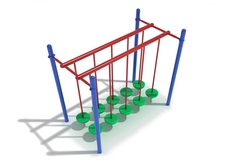 The Double Row Pebble Bridge is an unusual and exciting playground obstacle with moving pebble platforms that kids can step across to get from one side to the other. The platforms are hanging from pendulum-like beams which allow them to sway back and forth. This makes them deceptively tricky and fun to balance on. Fortunately, beams offer a secure and stable place for children to old onto before they take the next step, and each step is chained to the ground to prevent it from swinging too far. This model includes two parallel rows of steps with five platforms each.
