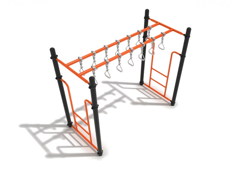 The Double Straight Swinging Ring Ladder is an upgrade to the single version. The addition of a second row of hanging ring grips greatly expands the fun and versatility of the structure. Rather than simply traveling in a straight line and grabbing the ring ahead of them, children are now free to move from left to right, switching between hands. It even expands the capacity of the structure so that two children can use it at once more easily. The structure is double-sided, with convenient ladders at both ends to facilitate easy entry and exits, and to allow children to go back and forth. This is an exciting way for children to improve their coordination and muscle development while having tons of fun.