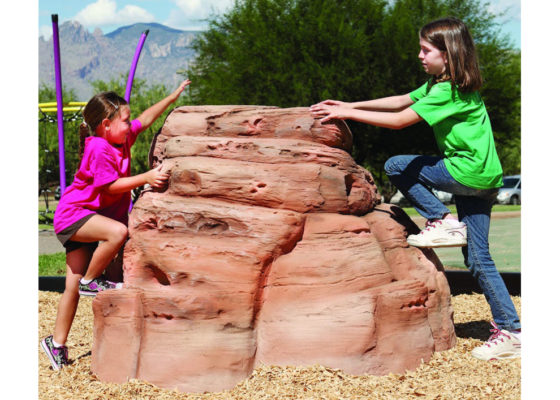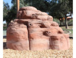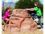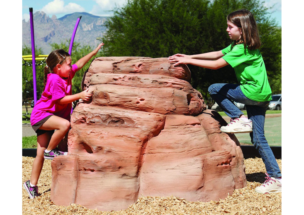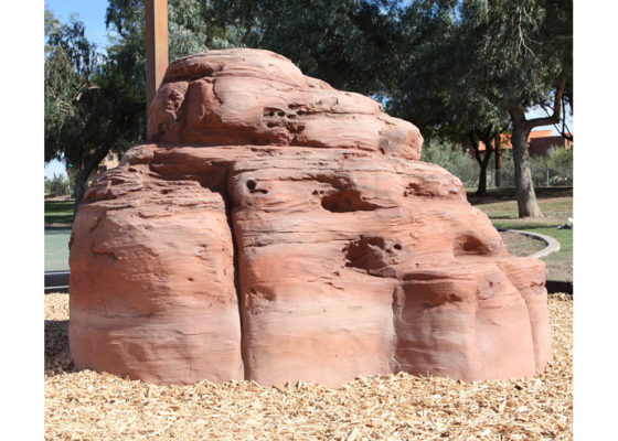 This Rust Sandstone colored NatureROCKS Small Boulder is a simple but functional structure for children to climb on, as well as a beautiful item of decoration which improves the aesthetic appeal of any playground. It is artfully modeled and designed to look just like real sandstone outcropping, although it is actually made from sturdy glass fiber reinforced concrete. It has a few small ledges which conveniently make it easy for even young children to climb, as well as a flat top that is wide enough to stand on. It is 3 feet tall at its highest point, and 6 feet by 5.5 feet at its base, making it large enough to accommodate two young climbers at once.