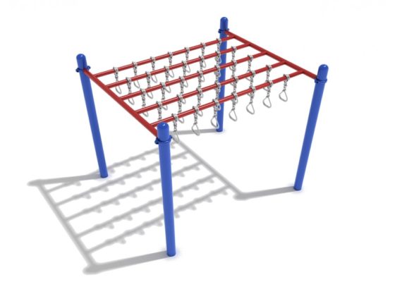 The Quintuple Straight Swinging Rung Ladder is a deluxe climbing structure complete with five overhead beams containing seven hanging ring grips each. These ring grips are designed to swing freely back and forth, allowing children to move in any direction they choose. Kids can swing from side to side, in circles, or even race up to four of their friends from one side to the other. The only limit is how long they can hang on, and the Quintuple Straight Swinging Ring Ladder provides comfortable ergonomically-shaped rings and upper body exercise to help with that. The large number of rings and wide area of this structure mean that it can support several children at once.