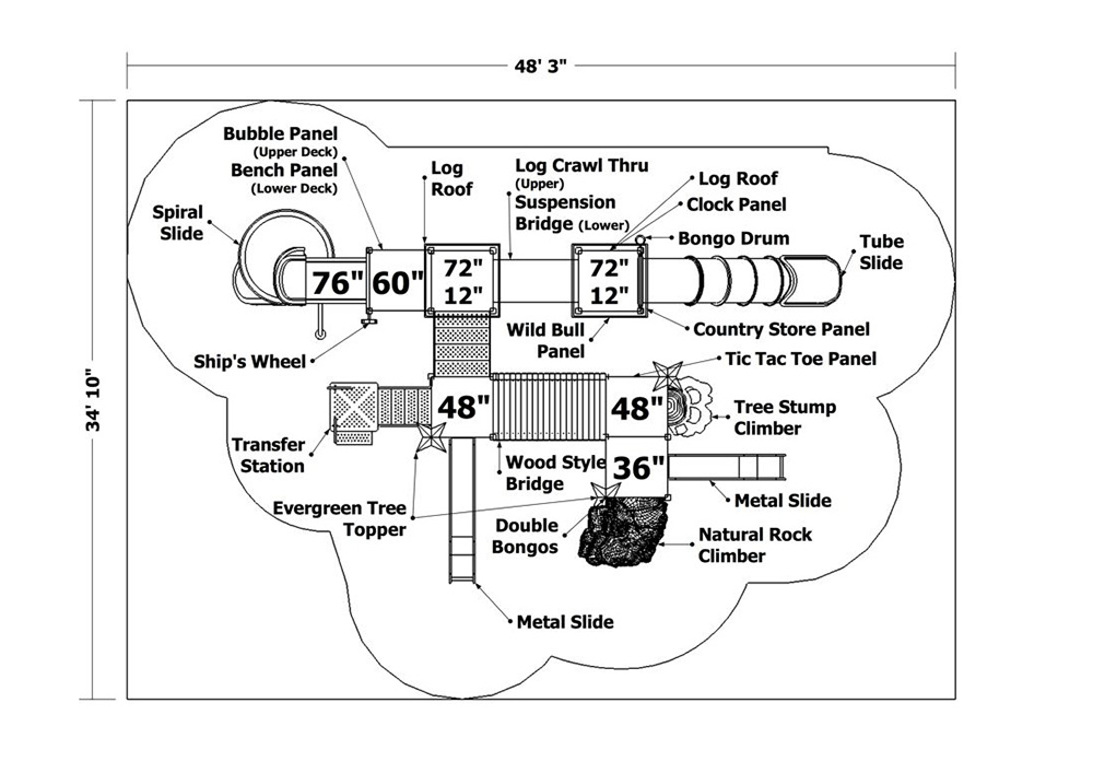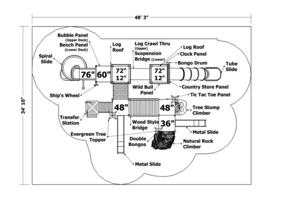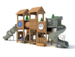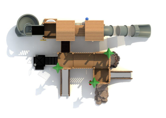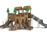 The Ranger Rock Play System double decker structure features many fun elements for children. A natural rock climber and a tree stop climber add to the natural theme of the unit. Log roofs shade children during play and a log crawl thru provides access from one deck to another. Below the log crawl thru is a suspension bridge. A wood style bridge lies on the other side of the unit. Evergreen tree toppers also add to the theme. A spiral slide, two metal slides, and tube slide are all featured. The tube slide features clear sections for children to peek out while zooming down.
