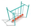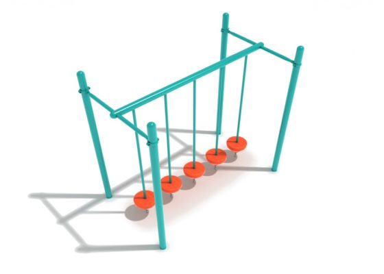The Single Row Pebble Bridge is an exciting playground obstacle for children to navigate. It consists of five pebble pendulum platforms hanging down from an overhead bar. These steps are each designed to shift and swing when stepped on, making them exciting and unpredictable. The overhead bar allows them to swing freely, but each platform is connected to the ground by a small chain, which prevents them from swinging too far. The wobbly steps have a large and slip-resistant surfaces which make them easier to balance on, and since they are circular children can step on any part of them and use them just as easily when crossing the path from either direction.